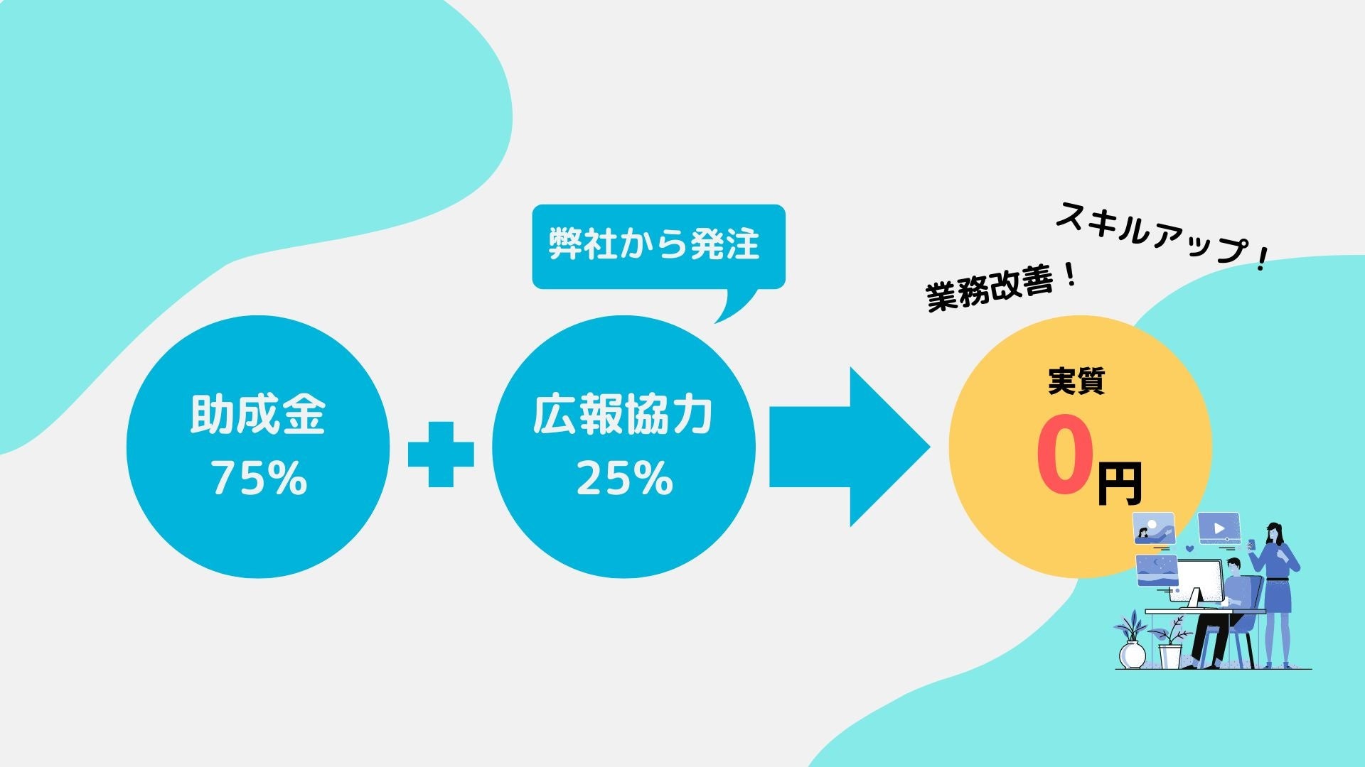 exllistのDX研修は助成金の活用による75%の助成と、弊社からの発注で25%分のお支払いをすることで実質0円でのDX研修を実現します。