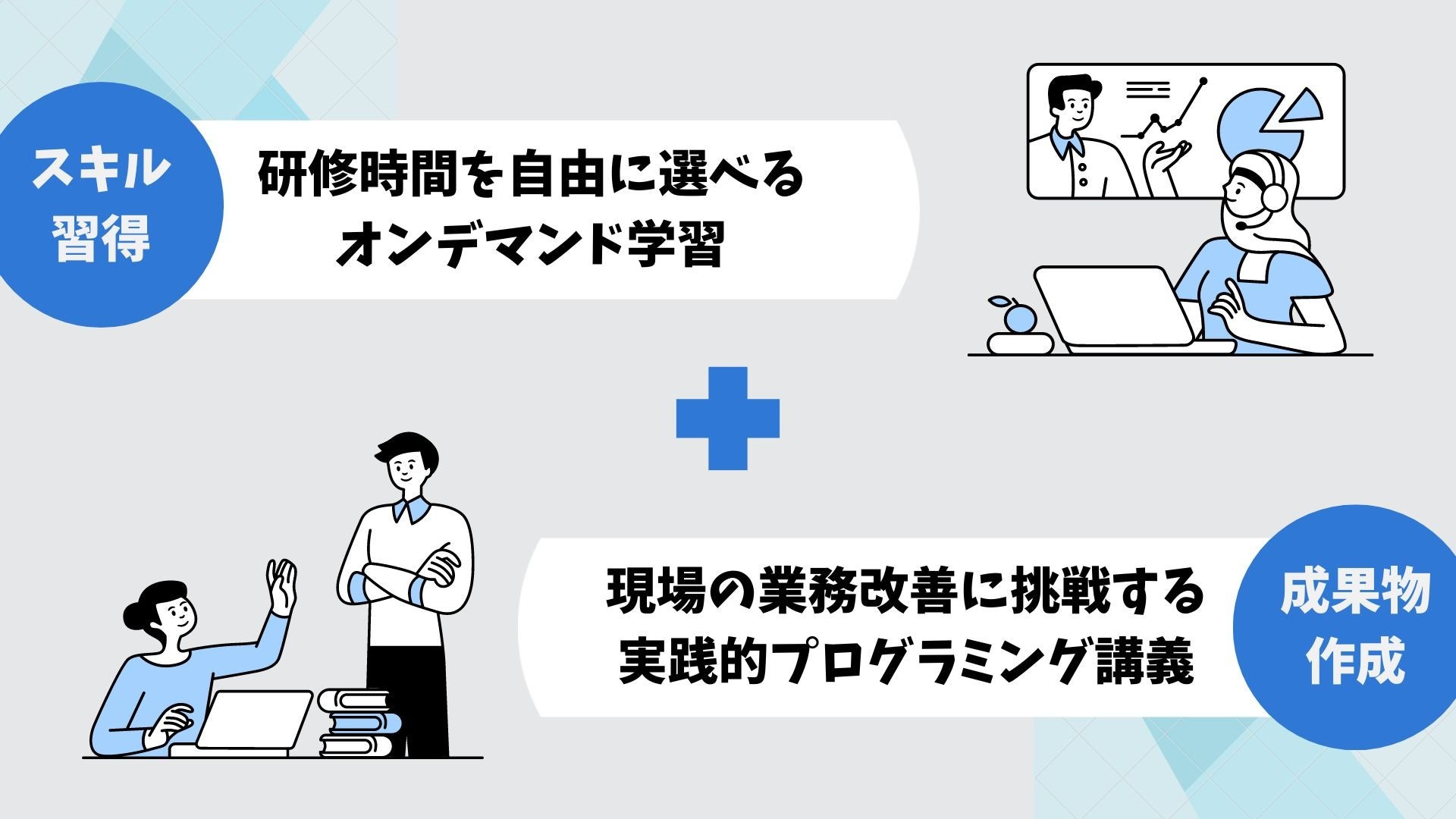だからこそライブ講義でしっかりと技術を指導し、その後に弊社スタッフとメンタリングしながら自身の現場に潜む業務課題の発見~解決策としてのシステム開発をゴールとした実践講座を用意しています。